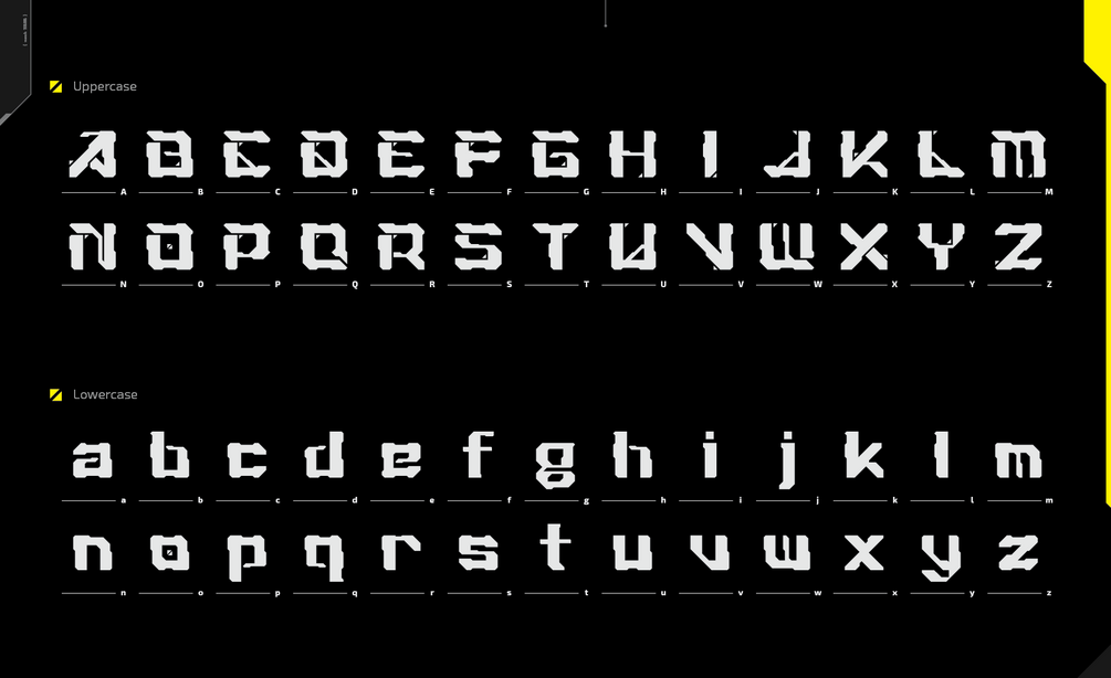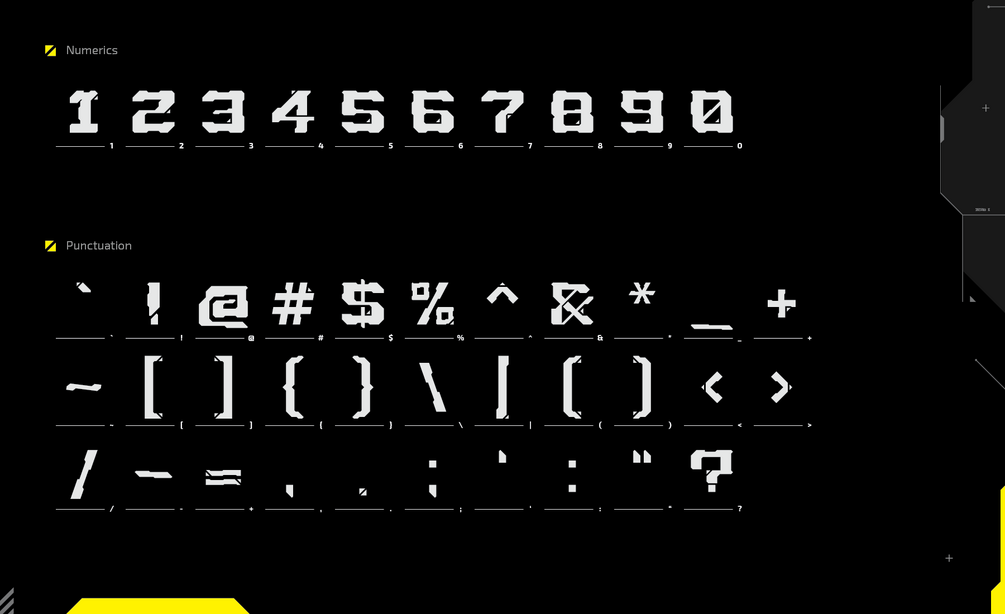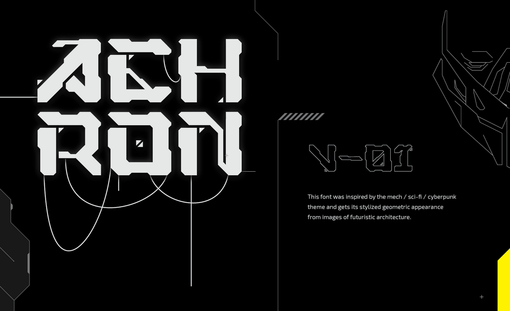 The Achron display font was inspired by mechanical and futuristic architecture, Achron's design features contrasting strokes and 145° geometric hard corners typical of industrial machine design. The font is tough and designed specifically as a large headline, suitable for sci-fi and cyberpunk themes. The fonts contain uppercase and lowercase letters, numbers, and 32 punctuation marks and are freely available to everyone, including commercial use.